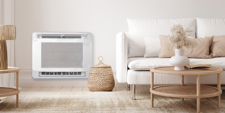 Diskret golvmodell med dubbla luftutblås, tyst gång och effektiv värme ned till –25 °C – perfekt för nordiskt klimat.
